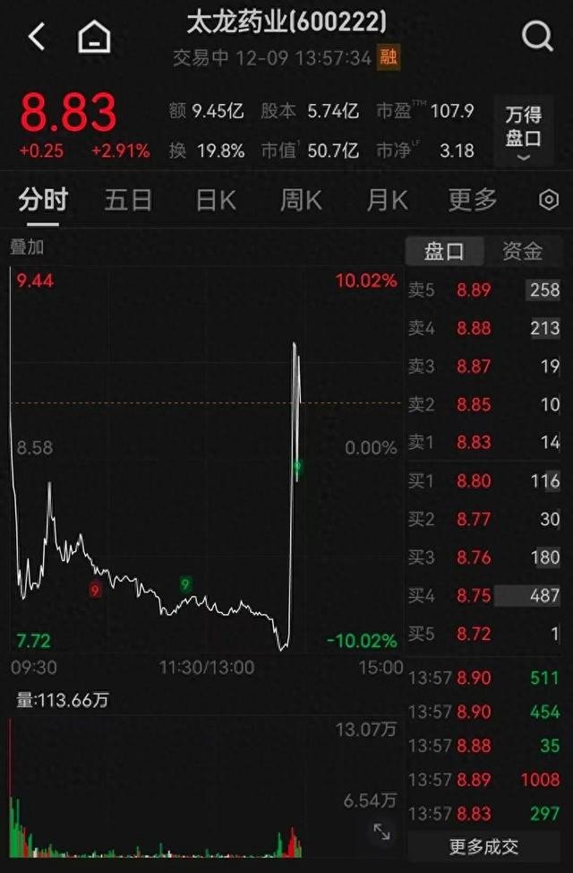 12月9日,太龙药业开盘涨停后下挫,午后盘中一度触及跌停,演出“六合板”。随后该股再度拉升,罢休发稿,太龙药业涨近3%,报8.83元。