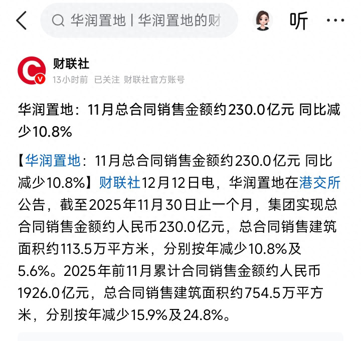 华润置地: 11月总公约金额230亿元, 同比减少10.8%, 是技术买房了